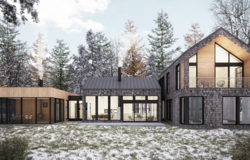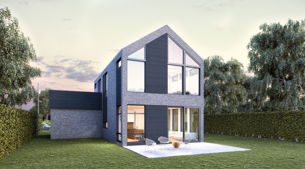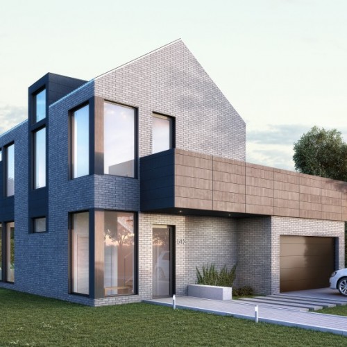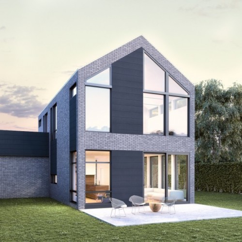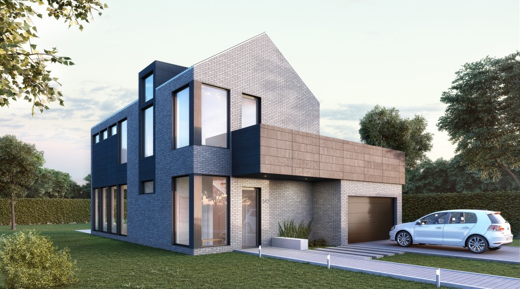 The rough esthetic of the brick and aluminum panels are offset by the clean lines of the windows and aluminum trims to form a very contemporary look that fits perfectly in either an urban or smaller country setting. A dormer insertion in the roof and corner windows both contribute to the home’s ample interior natural light.