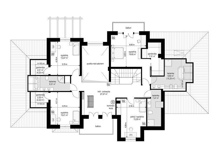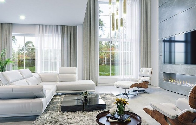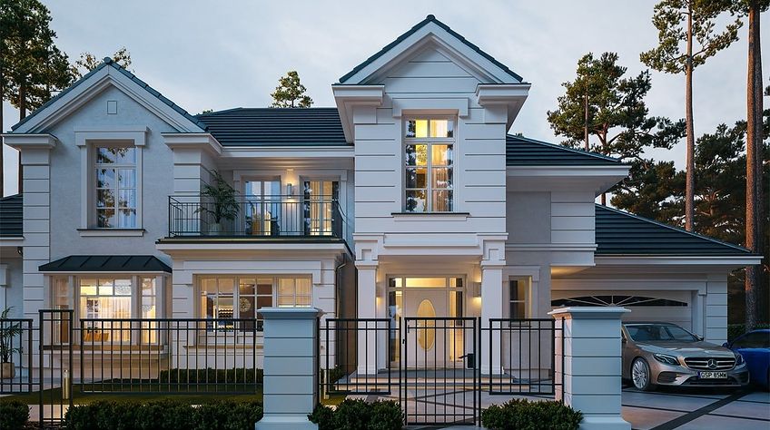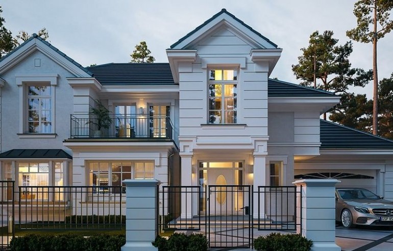 We present the Villa Seat project with a classic representative villa, whose architectural style refers to the best twentieth-century designs of suburban residences. The design draws on the historical patterns of residential architecture, is full of interesting details, and at the same time combines the completely modern function of a comfortable single-family house. The building is designed on a rectangular plan, with a wide front and garden façade, so that it fits perfectly on a square-shaped plot, leaving room for a nice garden and a lot of space from the front. The fragmented body consists of several smaller fragments. The core of the house is a multi-storey part enclosed around one-story extensions. From the front we have a beautifully accentuated entrance, with wide doors with floodlights, leading to the vestibule and the large hall. The front is also two beautiful bay windows - the kitchen and dining room of the household, and a balcony from the lounge-library on the first floor. The garage, set back a few meters to the rear, is inconspicuous, and at the same time moving back the garage increases the driveway. The rear facade of the villa is equally interesting. We have a two-story window from the living room opening a view of the garden and beautifully illuminating the living room, and two exits to the terrace - under the romantic pergola, and to a large arcade - a part of the terrace roofing. The large window from the study also opens onto the garden side. Upstairs, a wide balcony window with a balcony connects the bedroom of your house with a garden view. The interior of the house is functionally divided as follows: the entrance zone on the ground floor consists of a vestibule with a cloakroom, connected with a representative hall with stairs in front of the entrance. The end of this axis is the office. From the hall we go left to the living area, more private, and here we have a living room with a void open to the mezzanine on the first floor, a dining room - a real dining room, and a kitchen with a mini-dining room for quick everyday meals. The right side of the house is a garage with a utility room. The first floor is divided into two parts - separated by a void above the living room and a mezzanine, which is the home library and at the same time an extension of the ground floor living room. On the left side there are two children's bedrooms with wardrobes and a bathroom, on the right side there is a parents' apartment with a wardrobe and a bathing room, and one more bedroom with a bathroom. The house, despite its extensive plan and functions, and a truly representative silhouette, is not that big. Its surface is slightly larger than a normal single-family house, thus proving that you do not need to build a thousand-meter colossus to have everything - the whole set. The house is designed with energy-saving materials, has good insulation and modern installations. It will be inexpensive to use. When it comes to construction costs - it won't be cheap, but the end result is worth the sin in our opinion. If you want to have something beautiful, above average - it has to cost above average. This house will not leave anyone indifferent. Welcome!