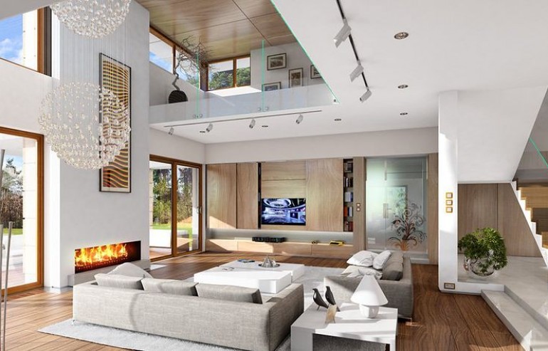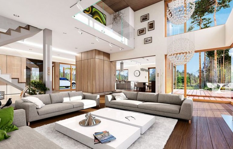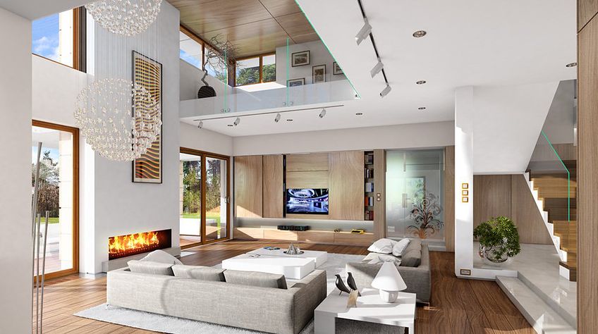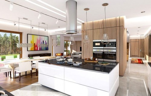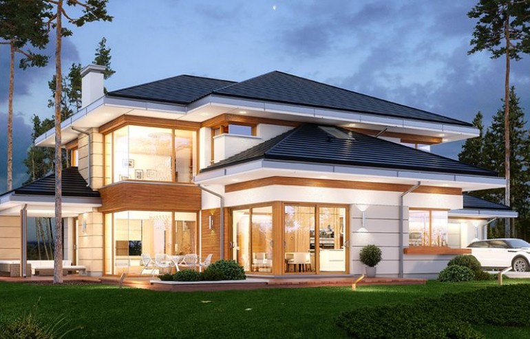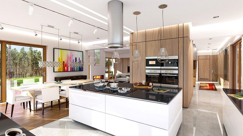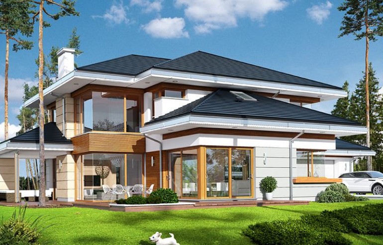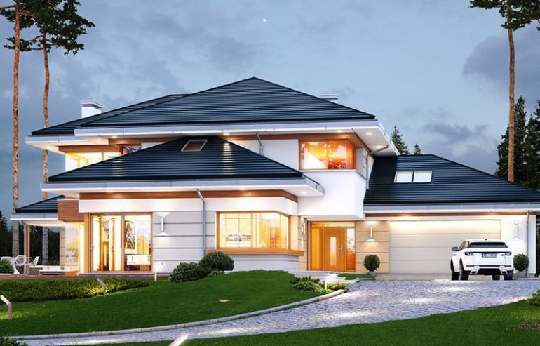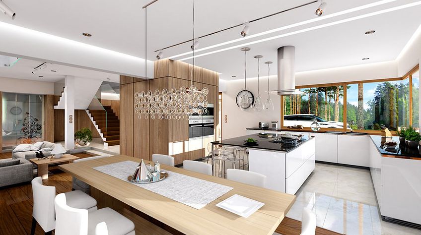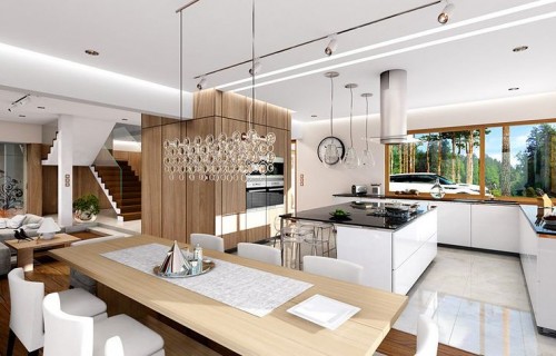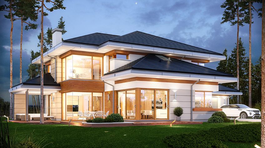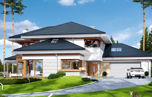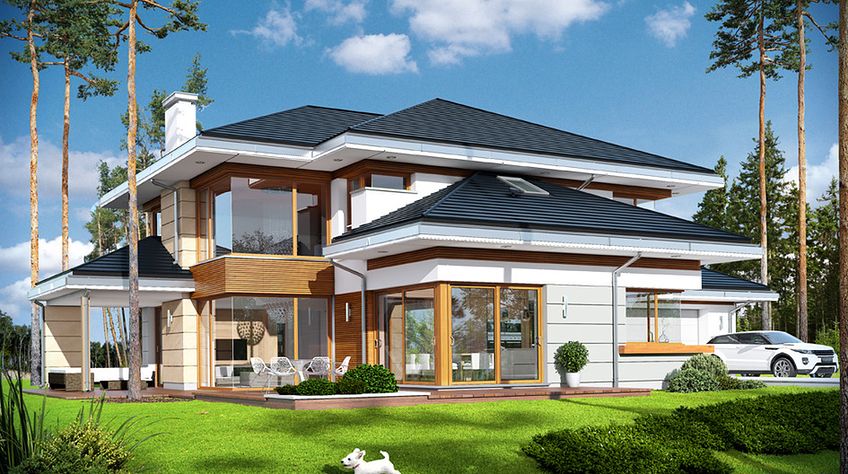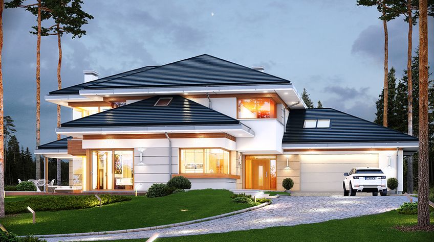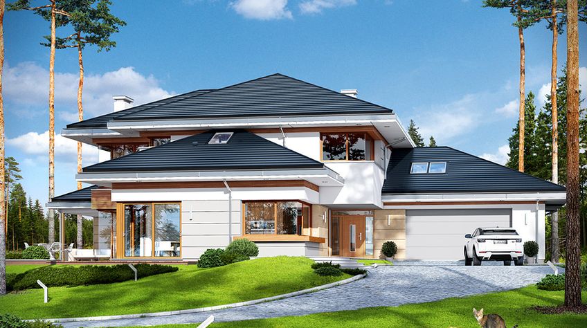 House plan The house with a view is intended for a medium-wide plot of land. The house is characterized by an L-shaped body, which allows it to be easily divided into zones. In this project, the ridge is located perpendicular to the road, which is important from the point of view of development conditions in a given area. The house has been designed with free-standing buildings in mind. The design proposes a double garage in the line of the building. It is also a great proposition for those looking for a house with an envelope roof that looks great. The House with a View project is a two-story house, which allows us to develop a larger area. The author of the project provided for an interesting day zone in it. An open kitchen is a solution that offers many arrangement possibilities, both modern and traditional. The table in the kitchen is an extremely functional solution that adds charm to it. Additionally, the planned pantry is the perfect place to store preserves and food supplies. The day zone is also created by a spacious living room and dining room. Additionally, the living room has a fireplace, which gives the interior a unique atmosphere. The project includes one comfortable bathroom on the ground floor and two additional bathrooms on the first floor. The night area consists of four bedrooms, which are perfect for a family of 4-6 people. The space can also be used as a guest room or office. The undoubted advantage of the design is a functional wardrobe. In addition to this, there is also a utility room in the house that can be used according to your needs. The mezzanine included in the design gives the interior a unique character. The impressive terrace allows you to come into contact with nature without too far away from the privacy of your home. The project was created for investors who plan to build a house in brick technology. Its shape shows solutions referring to the modern style and will perfectly fit into the trends of newly developed housing estates.