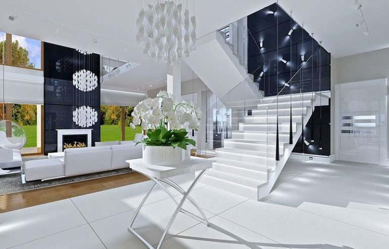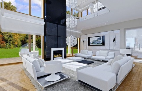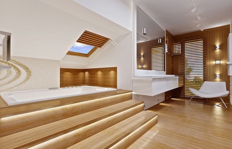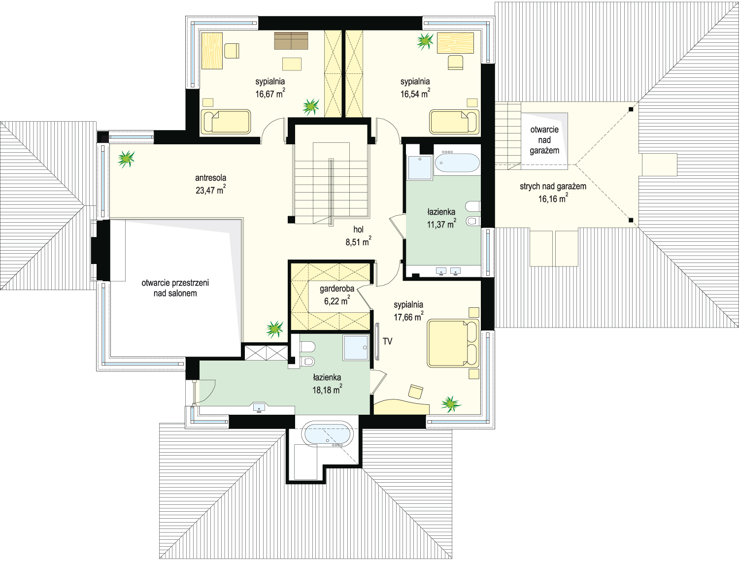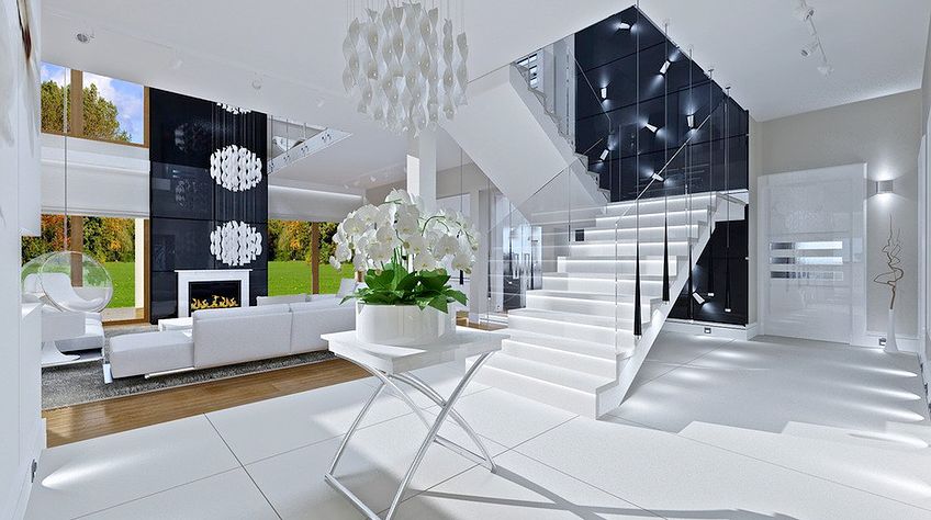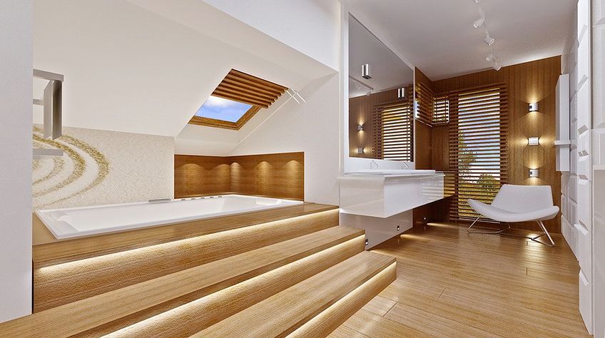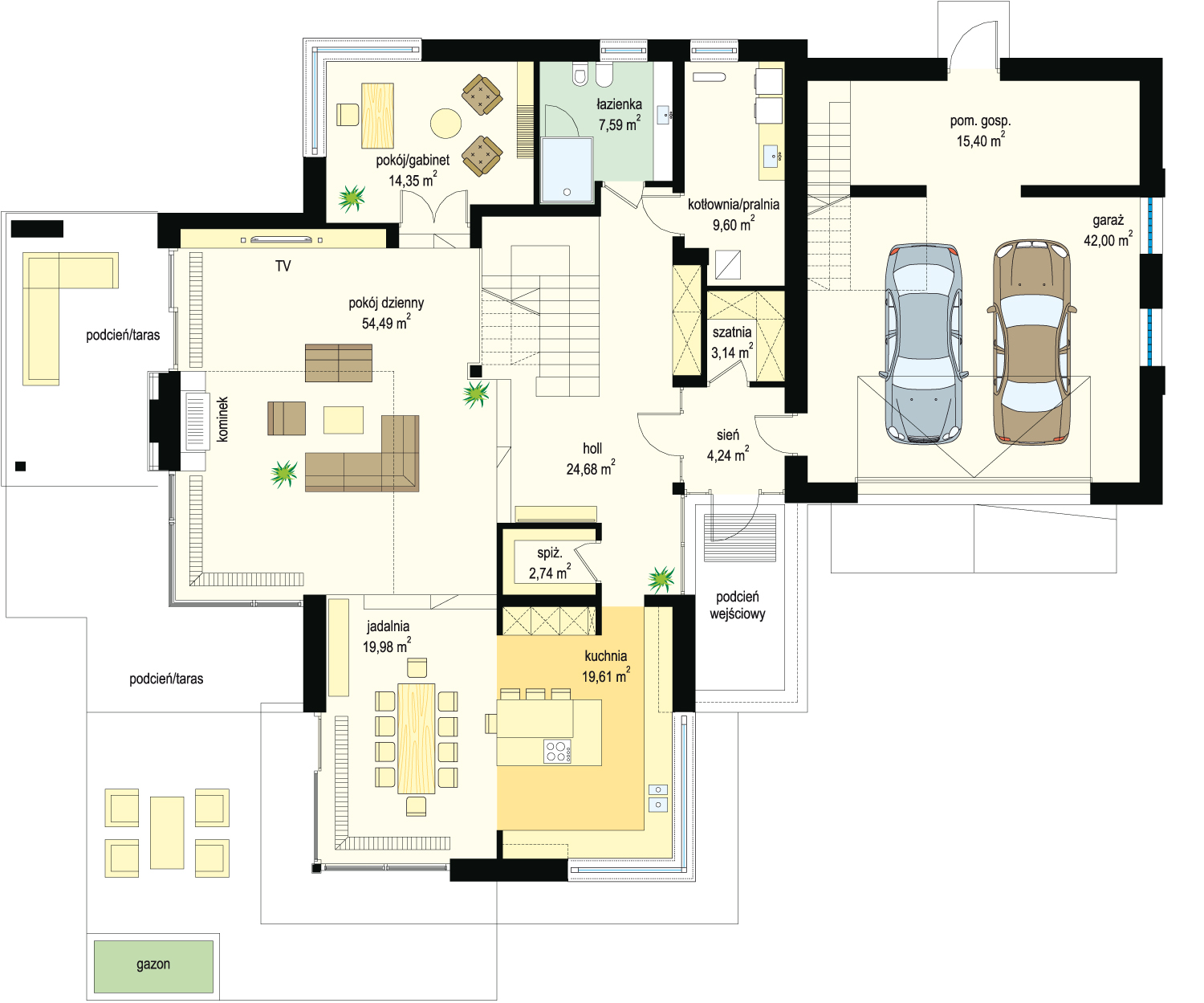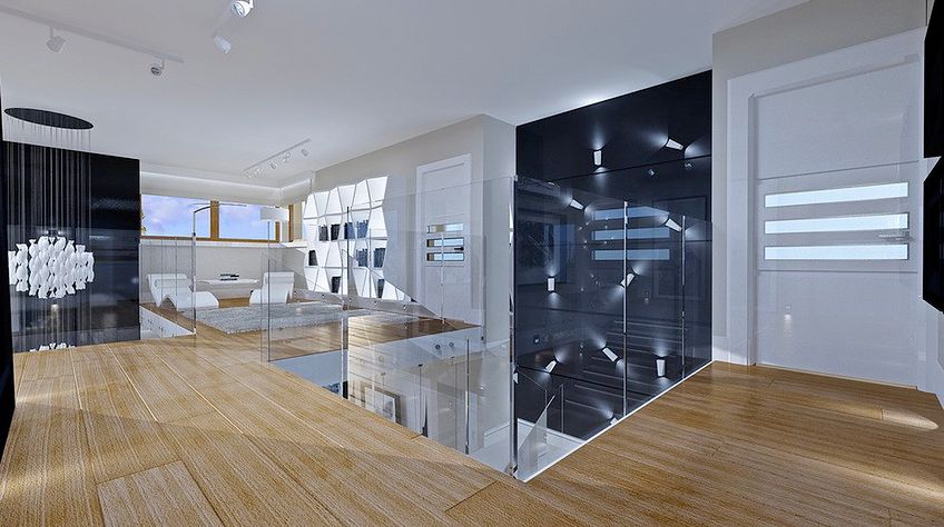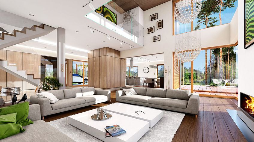 House plan The house with a view is intended for a medium-wide plot of land. The house is characterized by an L-shaped body, which allows it to be easily divided into zones. In this project, the ridge is located perpendicular to the road, which is important from the point of view of development conditions in a given area. The house has been designed with free-standing buildings in mind. The design proposes a double garage in the line of the building. It is also a great proposition for those looking for a house with an envelope roof that looks great. The House with a View project is a two-story house, which allows us to develop a larger area. The author of the project provided for an interesting day zone in it. An open kitchen is a solution that offers many arrangement possibilities, both modern and traditional. The table in the kitchen is an extremely functional solution that adds charm to it. Additionally, the planned pantry is the perfect place to store preserves and food supplies. The day zone is also created by a spacious living room and dining room. Additionally, the living room has a fireplace, which gives the interior a unique atmosphere. The project includes one comfortable bathroom on the ground floor and two additional bathrooms on the first floor. The night area consists of four bedrooms, which are perfect for a family of 4-6 people. The space can also be used as a guest room or office. The undoubted advantage of the design is a functional wardrobe. In addition to this, there is also a utility room in the house that can be used according to your needs. The mezzanine included in the design gives the interior a unique character. The impressive terrace allows you to come into contact with nature without too far away from the privacy of your home. The project was created for investors who plan to build a house in brick technology. Its shape shows solutions referring to the modern style and will perfectly fit into the trends of newly developed housing estates.