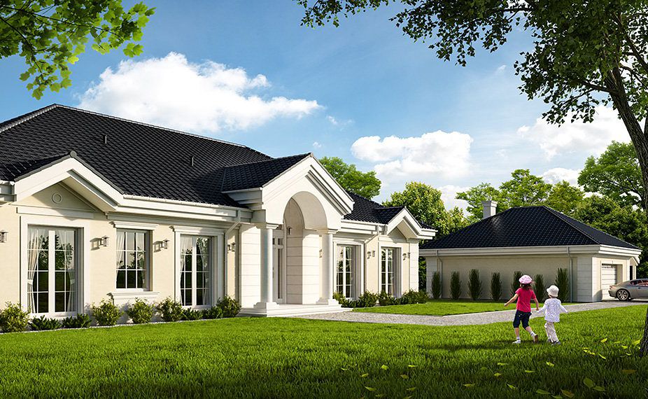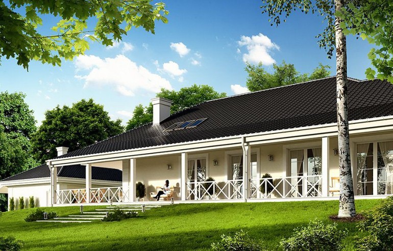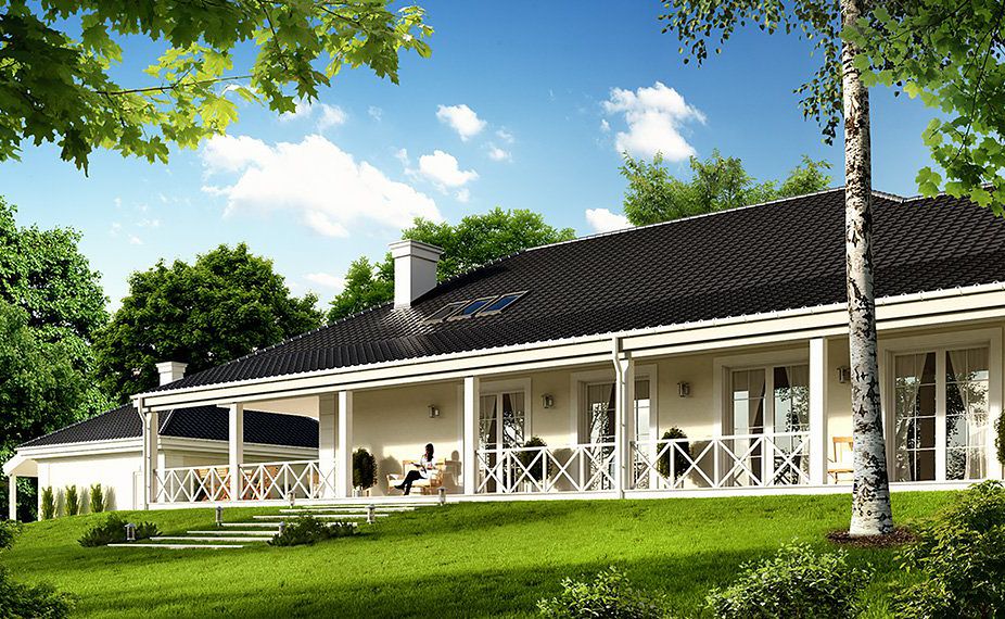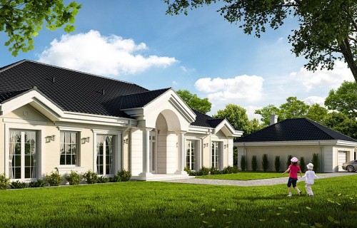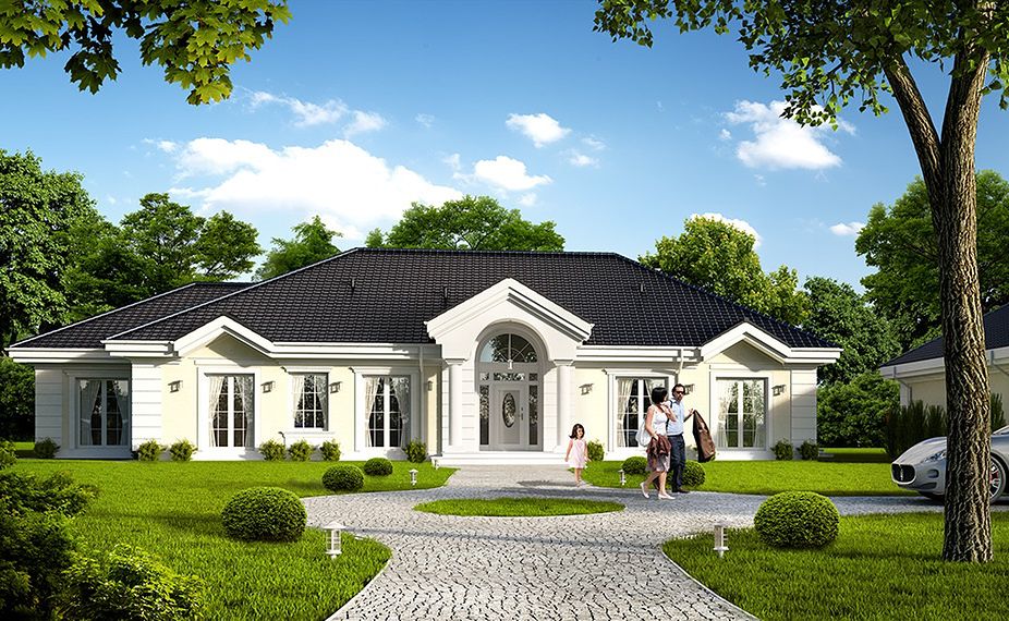 The design of the Rezydencja Parkowa 4 house was created on the model of the popular Rezydencja Parkowa project. In contrast to the basic version, the project has a smaller area, however, there is no garage. House design Park Residence 4 is a perfect solution for people with a plot of medium width. The body of the building has a typical form, which makes it cheap to build. The project belongs to the category of houses with a ridge directed parallel to the road, which is very important when building conditions require it. The house was created for free-standing buildings. It is also an interesting proposition for people looking for a house with a hipped roof that looks interesting. The Park Residence 4 project is a one-story house, which is certainly a huge advantage in the case of elderly people, disabled people and couples with young children. The heart of the house is a spacious day zone, which is conducive to spending time together with your loved ones. Perfectly thought-out solutions in the kitchen offer many arrangement options and facilitate everyday use. The architect also provided a place for a dining room, thanks to which shared meals will be an excellent opportunity to talk in a family atmosphere. The author of the project provided two bathrooms with optimal dimensions. The night area consists of four bedrooms, which are perfect for a family of 4-6 people. The space can also be used as a guest room or office. The utility room included in the house also influences the comfortable use of the house. The impressive terrace allows you to come into contact with nature without too far away from the privacy of your home. In addition, the porch planned in the project will make it impossible for anyone to pass by this house. The building was designed in brick technology. Its body features solutions referring to the traditional style, so it will look great regardless of the area.
