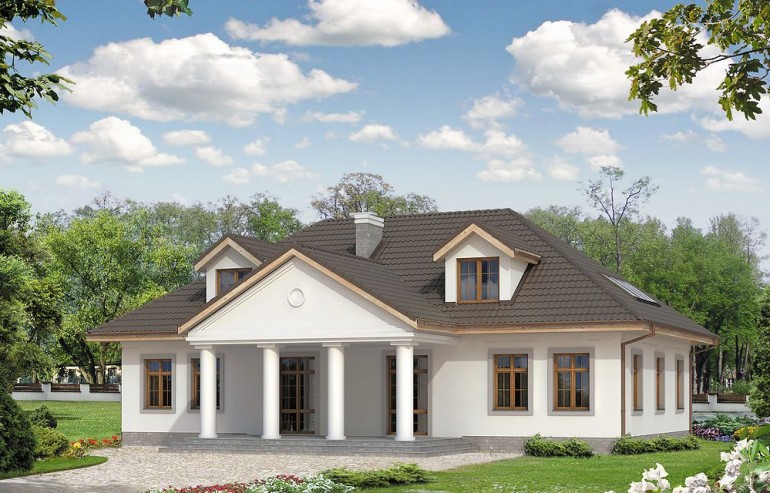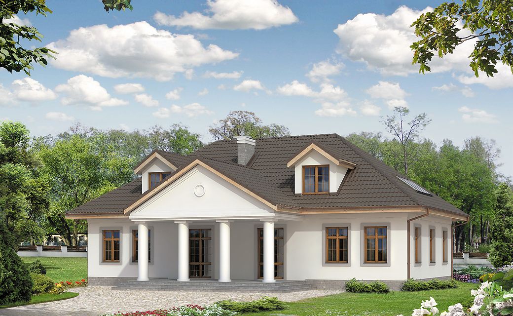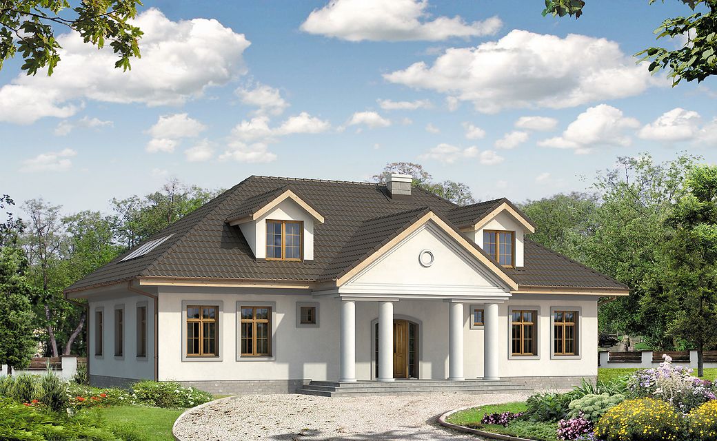 The Tercja 5 building is an alternative to the popular Tercja project. Unlike the base version, the design has more rooms, a larger area, a basement. Tercja 5 house plan suitable for a medium-wide plot. The house has a typical shape, so it will look good regardless of its surroundings. The project belongs to the category of houses with a ridge located parallel to the road, which is often specified in the spatial development plan. It is intended for free-standing buildings. It is also an excellent proposition for people looking for a house with an envelope roof, which is characterized by high resistance to adverse weather conditions. The Tercja 5 project is a one-story house with an attic, which makes its area clearly divided into zones: day and night. The building has a basement where you can arrange a laundry room and a utility room. Supporters of spacious spaces will surely be pleased with the living area provided for in the design. The author of the project provided for an open kitchen in it, which gives the interior more spaciousness. In addition, there is a place to put a table, which is conducive to shared family meals. The pantry included in the design will greatly facilitate keeping order. The design includes two comfortable bathrooms - one is on the ground floor and the other in the attic. In addition, there is an additional, separate toilet at the bottom. The seven bedrooms included in the house are the optimal option for a large family. The space can also be used as a guest room or office. Certainly, every lady of the house will appreciate the advantages of the wardrobe provided for in the design. The terrace is an ideal place to organize family meetings and moments of relaxation. The project was made in brick technology, thanks to which the house remains pleasantly cool in hot weather. Its shape features solutions referring to the manor house style and will perfectly fit into the rural landscape.