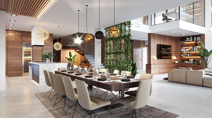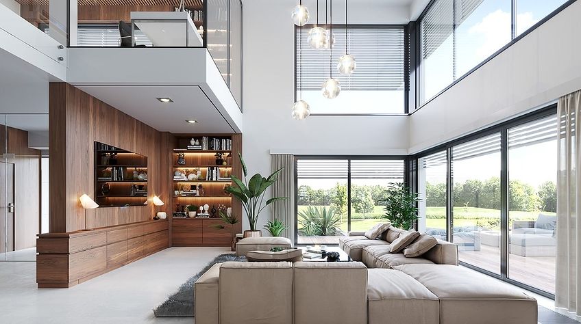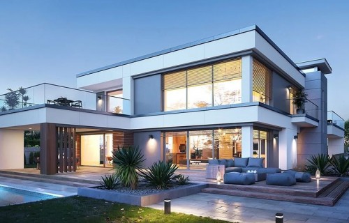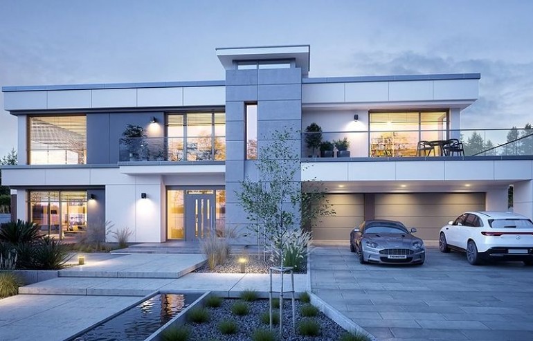 The Villa Florida 5 house plan is another luxury mansion project from the "Willa Florida" series. The house is a comfortable, two-story villa, intended for a plot with a side or front garden. The architecture of the house combines a modern form with a functional interior. Stylish, varied shape and representative interior will emphasize the status and good taste of the owners. The fragmented two-story silhouette of the house is covered with a hipped roof, practically invisible from the height of human eyes, giving the impression of a building with a flat roof, with - in fact, a sloping roof (a frequent requirement in the building conditions). The elevations have been divided into strips of windows interwoven with white beams separating the storeys, introducing rhythm and order. We enter the building through elegant wide entrance doors with side lights under the balcony roof. The front of the house is decorated here with a vertical two-story wall with skylight, large windows in the corners of the facade, and a comfortable carport in front of the three-car garage. The garden façade in Villa Flory 5 is the side façade of the house with a large covered terrace - a place for evening feasts, and large corner glazing of the living room. The interior of the ground floor is primarily a huge single-space area of the hall, living room, dining room and kitchen rooms. It is almost 150 m2 of free, open living space. There is a representative staircase to the first floor, a living room with a large void and opening to the mezzanine above, with a delightful lounge suite and a TV wall. We have a dining room with a table for 14 or more people and a beautiful gas fireplace, we have a kitchen with an island, and a garden in the center for representative plants, and plenty of space to display unique paintings and other works of art. Everything is bathed in the light of wide, two-story glazing. In the back room, behind the kitchen, we have utility rooms such as a laundry room, pantry or boiler room. At the entrance: a cloakroom, toilet and access to a three-car garage. The first floor is the master bedroom with wardrobes and a bathroom, and an additional spare room and two children's bedrooms with their own second bathroom. A beautifully glazed home office or library room hangs above the living room, and a mezzanine opening onto the ground floor and the garden. All rooms on the first floor have access to the surrounding terraces. The master bedroom has a separate very large terrace overlooking the garden. Willa Flory 5 is another proposal of a large luxury house for brave Investors who want to fulfill their dreams of a unique place to live, who want to enjoy remarkable - modern at the same time non-flashy and tasteful architecture.