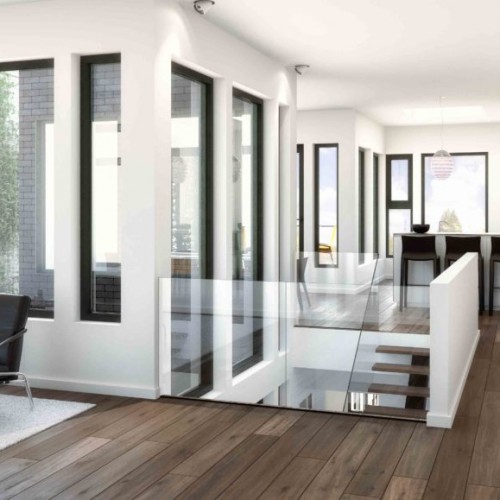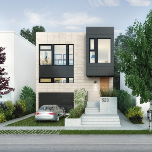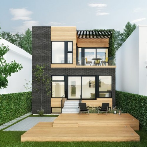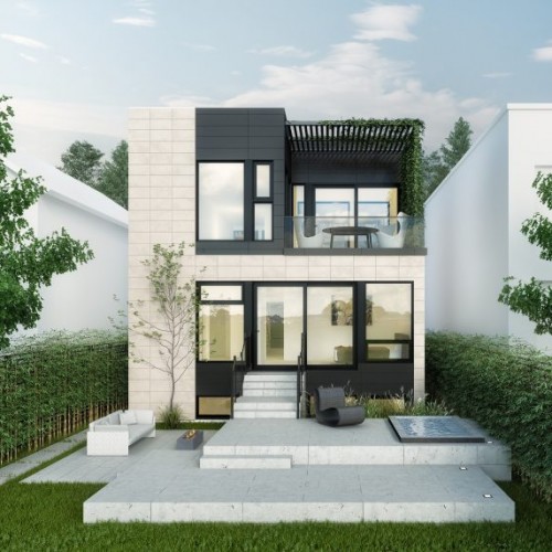 The living room at the front of the building features a fireplace and is cantilevered over the entrance and leads through to the master bedroom with an open bathroom, a walk-in closet and a TV room facing the interior courtyard. The corridor leading to the large master bedroom has a double-height ceiling with natural light from a full glass wall that looks through to the interior courtyard. The first floor kitchen and dining room are separated from the living room by the interior courtyard and staircase, while a backyard patio is covered for privacy with a JNCN pergola that extends the kitchen area to form an urban garden. The home also features two bedrooms, a shared bathroom, and a laundryutility room, with a mudroom shared between the garage entrance and the main entrance.