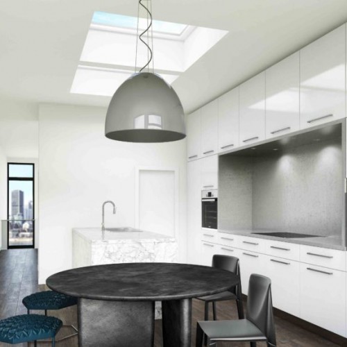 The standout feature of this inspirationis a reversal of the traditional story configuration, with the bedrooms in the basement and ground floor, and the kitchen, dining room and office situated on the top floor. The first floor has a double-height master bedroom with a curtain glass wall looking out onto the street.