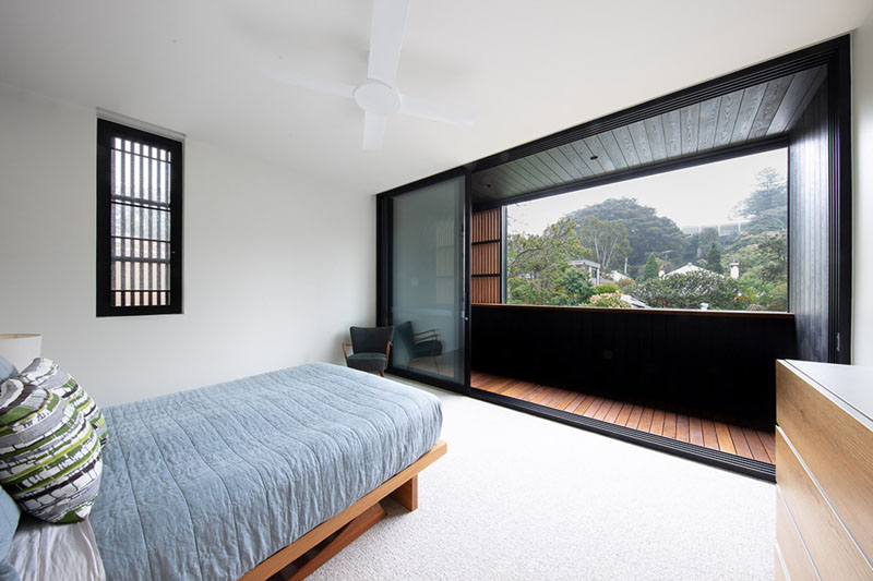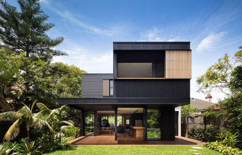 The Exterior Of This House Has Blackened Wood Siding With Contrasting Light Wood Shutters