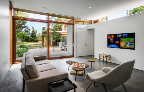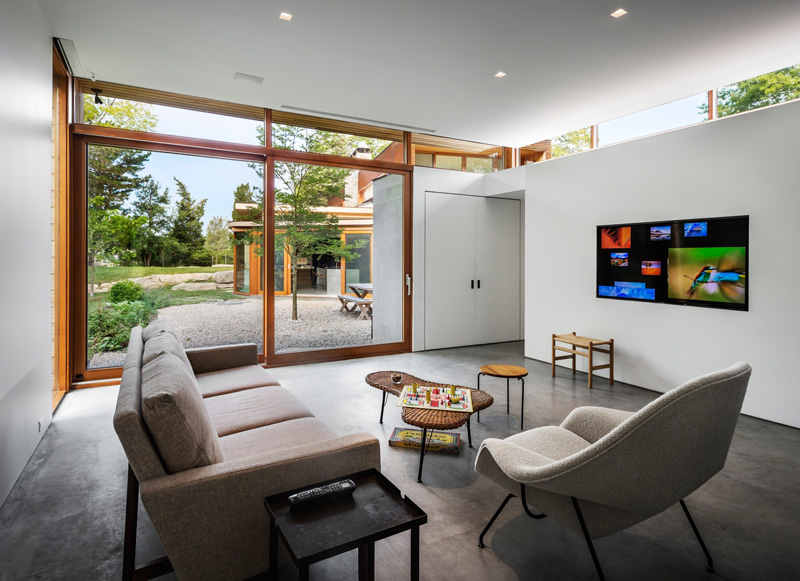 A large stone wall runs through this redesigned home in Connecticut