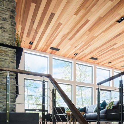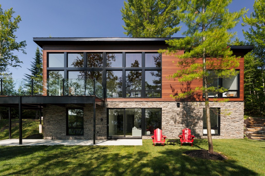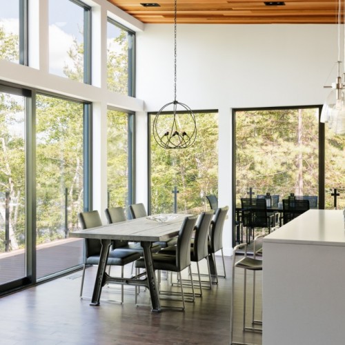 This beautiful secondary home overlooking a majestic lake is defined by its large windows and large open spaces. The optimized room configuration creates a warm and timeless design. The integrated outdoor terrace opens the interior living space onto nature’s canvas.